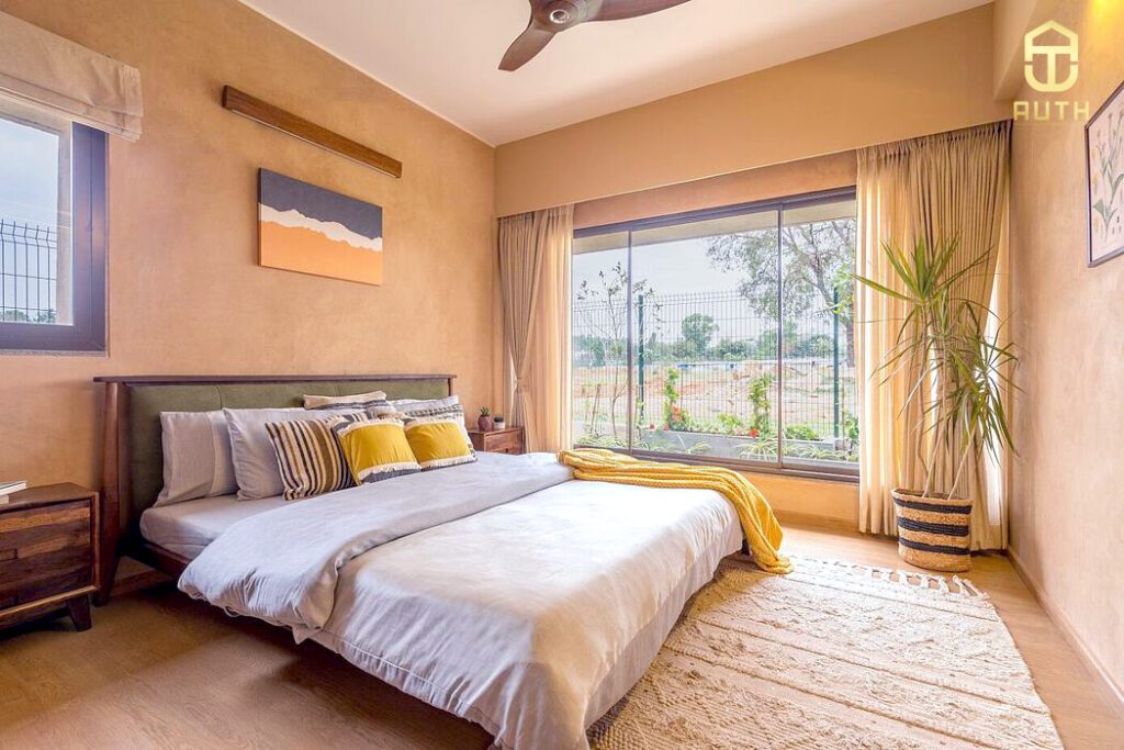 Phòng ngủ nổi bật với yếu tố thiết kế đơn giản, để tôn lên tông màu tự nhiên của nội thất.