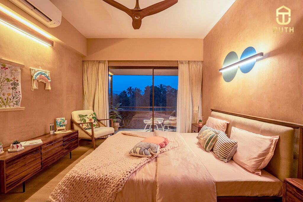 Các gam màu bài trí cho phòng ngủ làm tăng hoàn hảo chi tiết kết cấu đẹp của các yếu tố trong không gian.