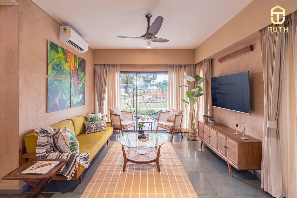 Khung cảnh nội thất vượt lên trên sự kết hợp giữa kỹ thuật trát vôi cũ kỹ với đồ nội thất. Theo phong cách MID-CENTURY.