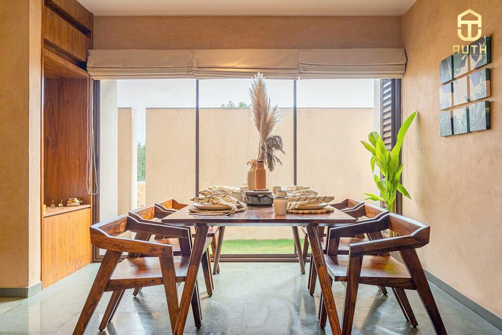 KTS nhà Auth khéo léo lựa chọn ánh sáng bê tông tiếp xúc phía trên bàn ăn, nhấn mạnh bản chất thực của vật liệu và màu sắc.