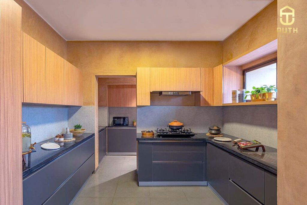 Không gian bếp nổi bật nhờ bộ ba màu sắc và họa tiết. Sự đồng nhất của không gian được nhấn mạnh thông qua việc sử dụng các kết cấu tương phản. Nhưng cộng hưởng màu sắc một cách hoàn hảo.